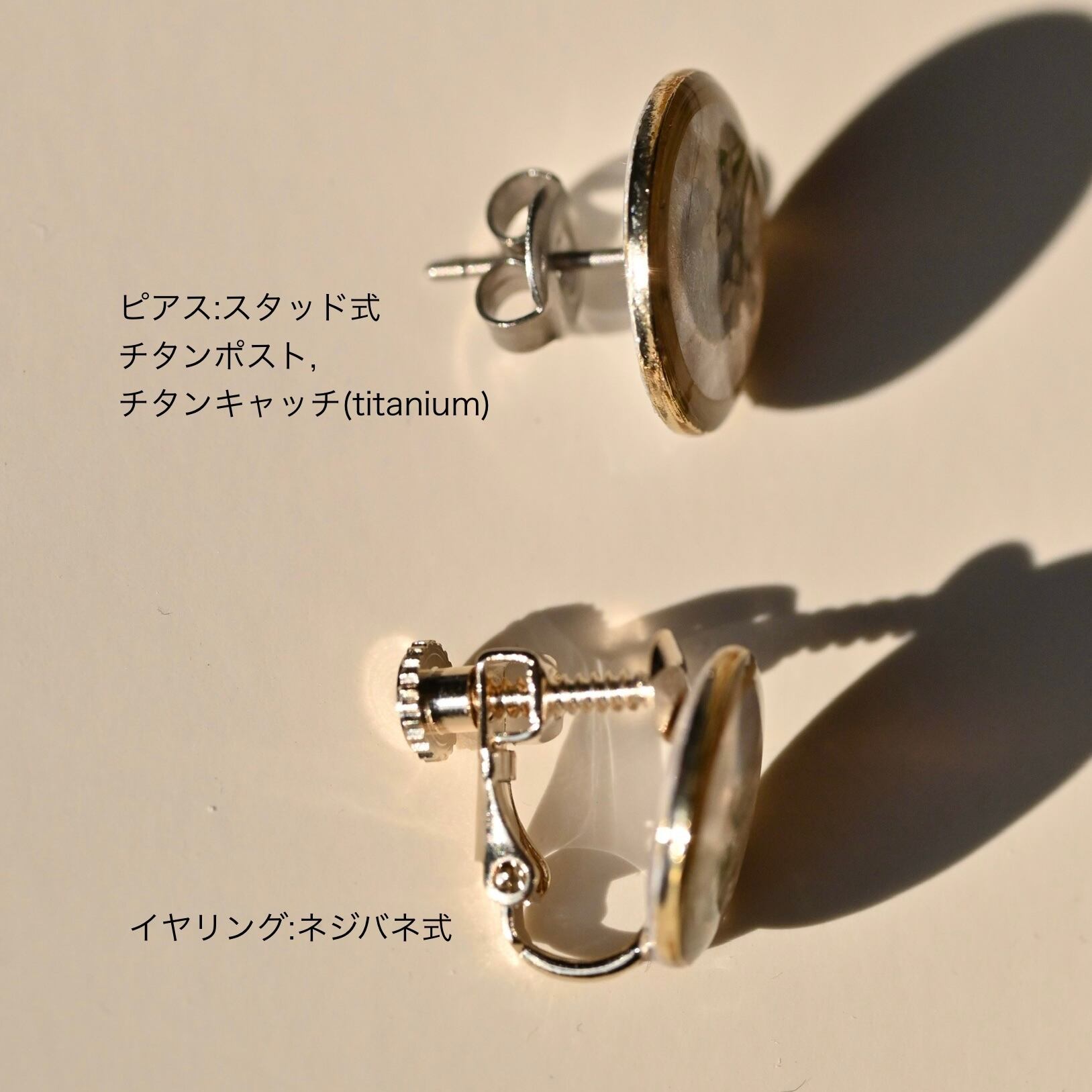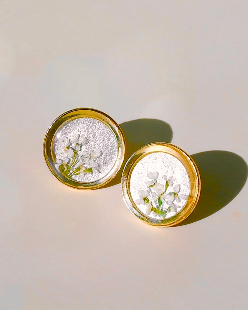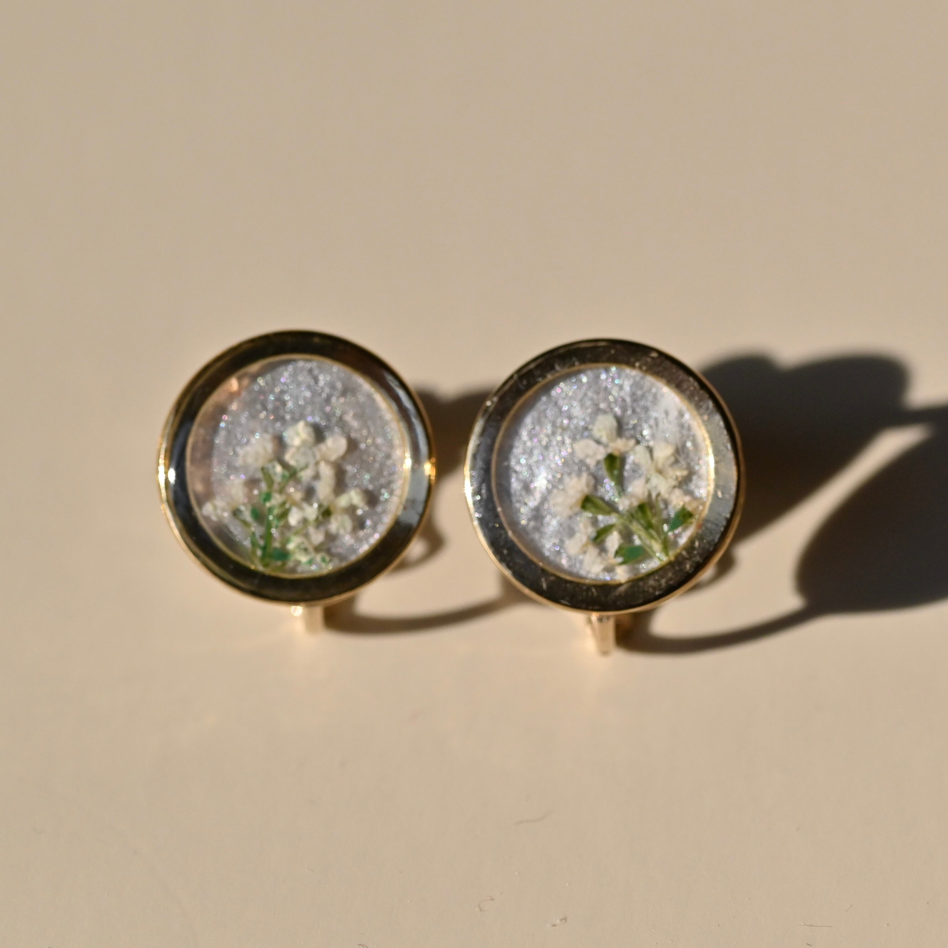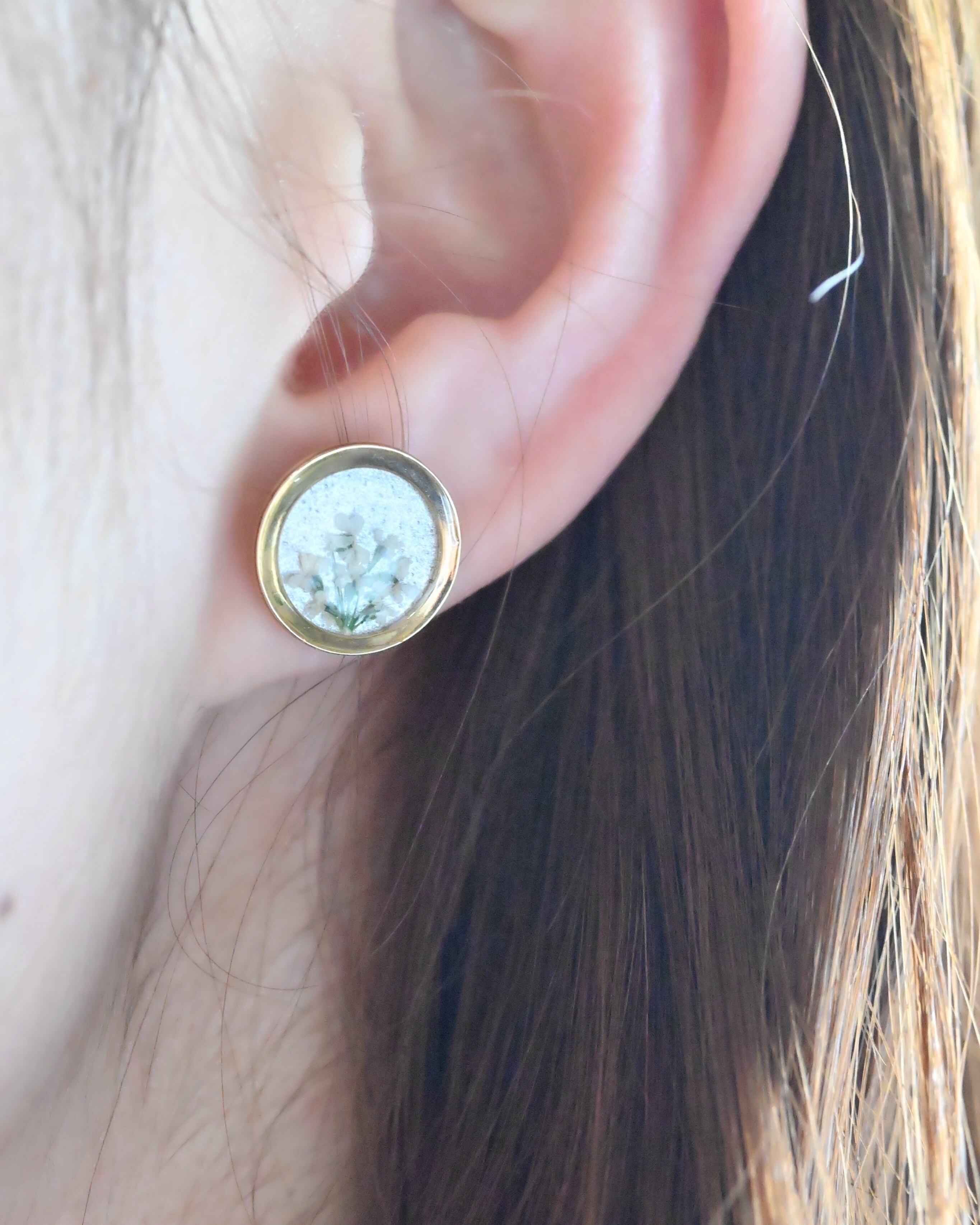 レースフラワーの押し花をあしらったピアス/イヤリングです。