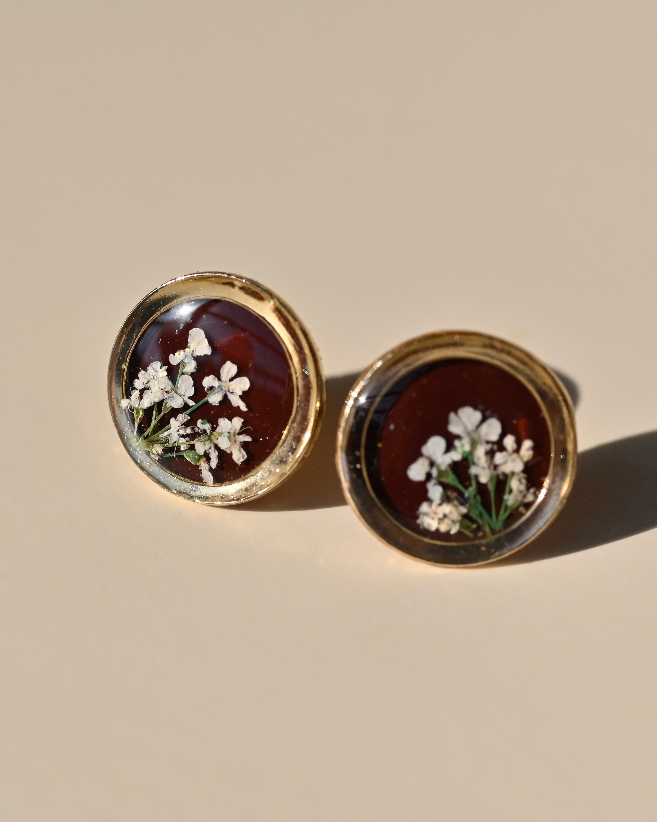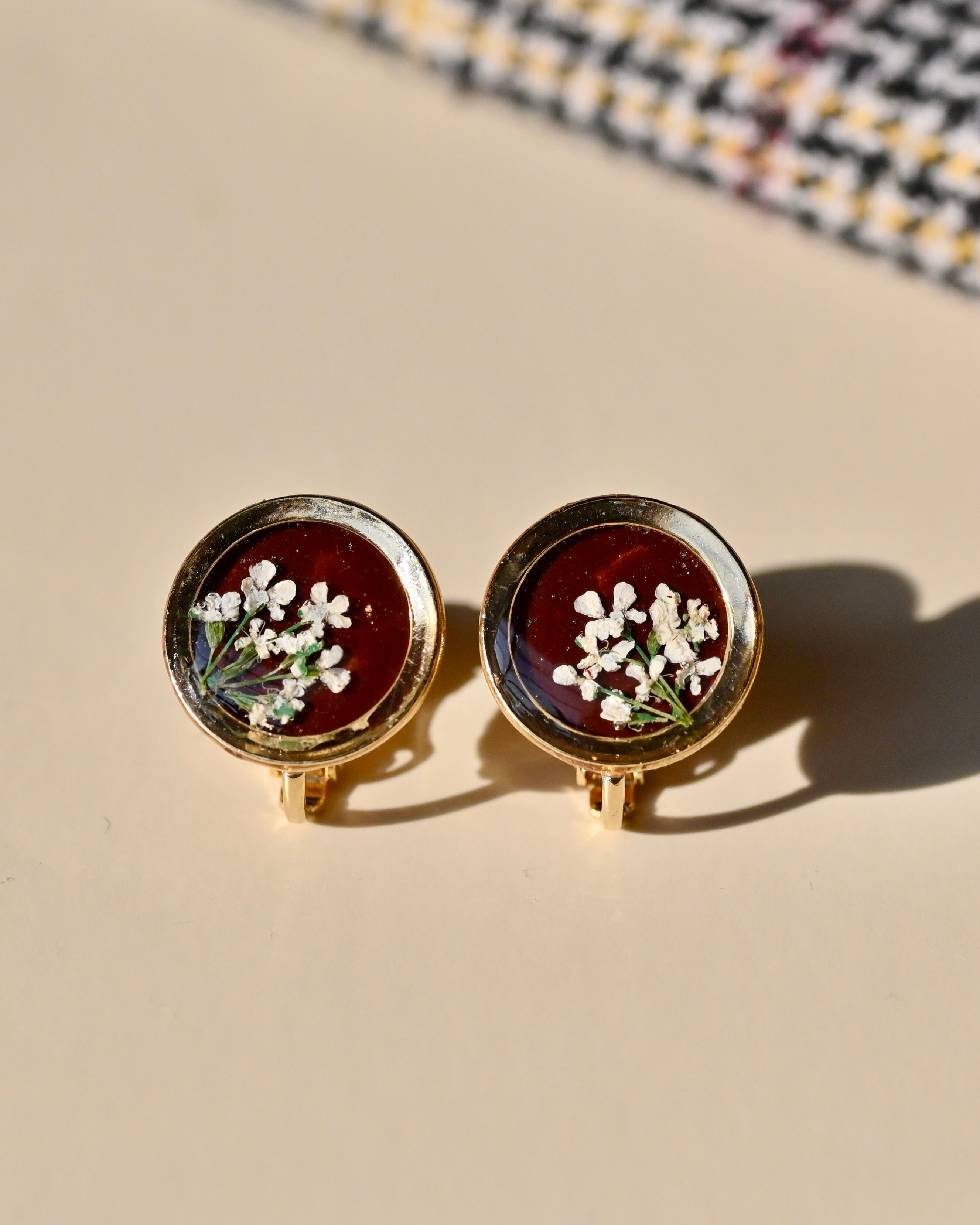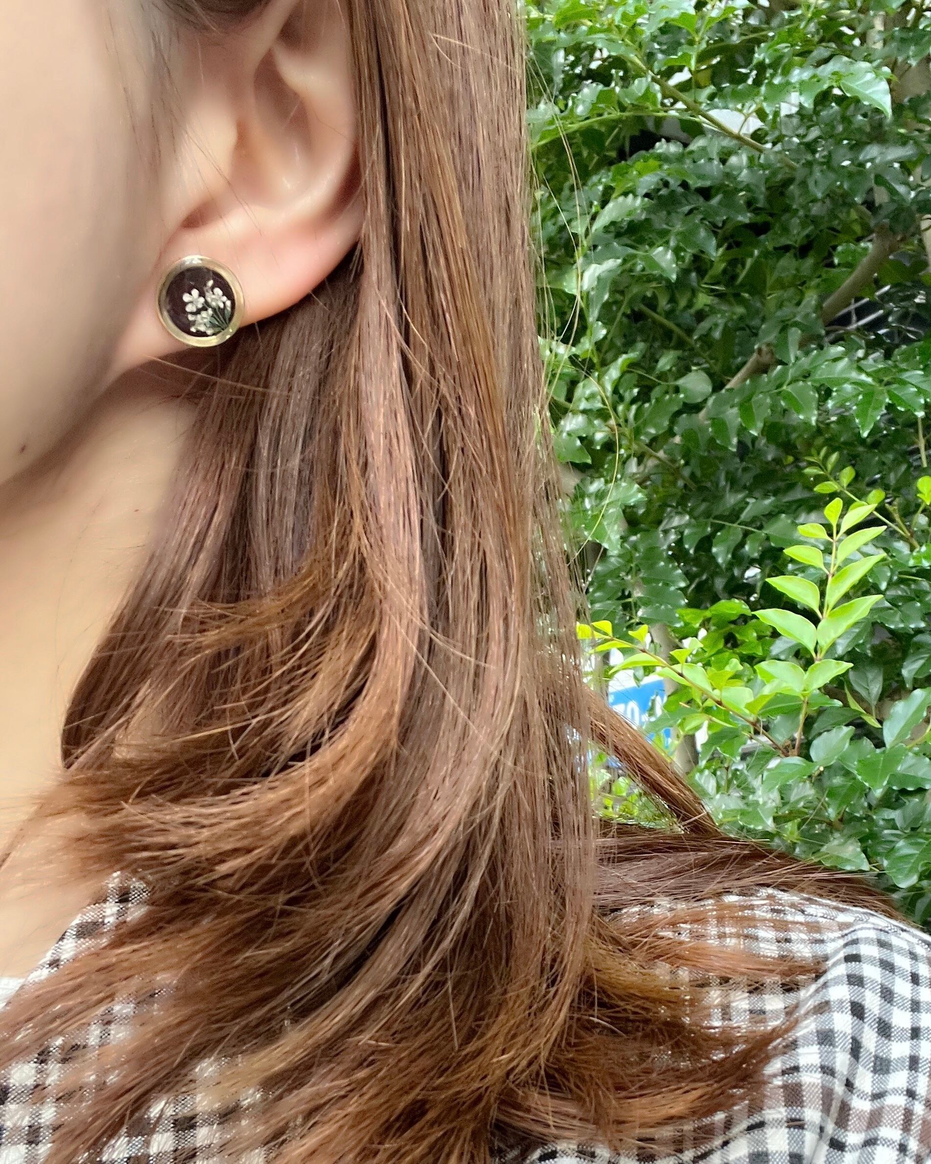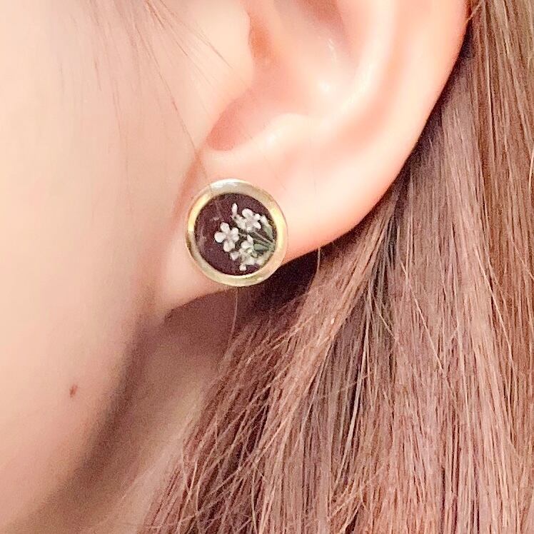 レースフラワーの押し花をあしらったピアス/イヤリングです。