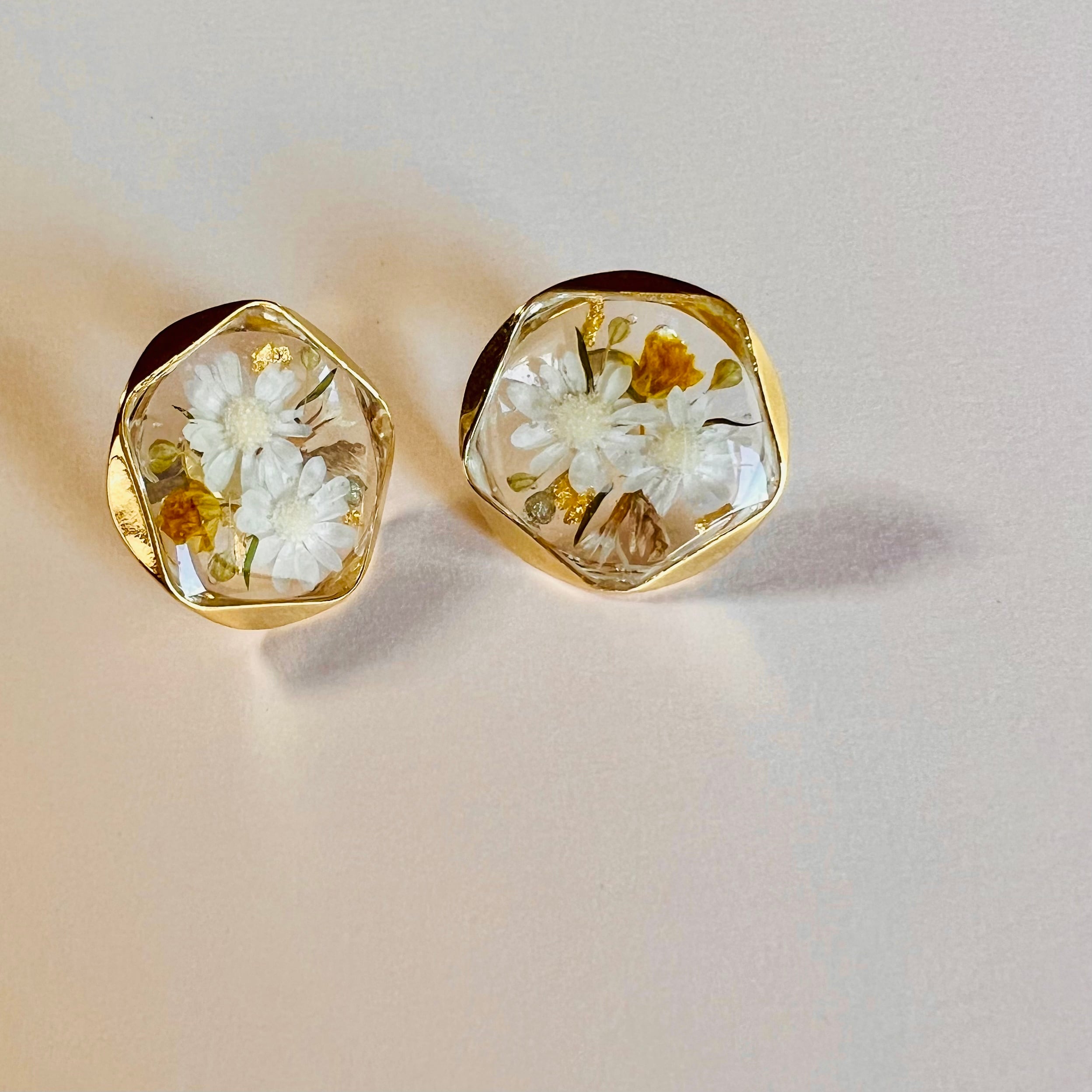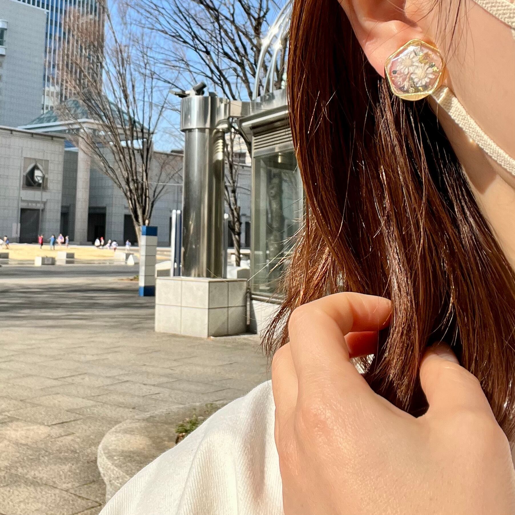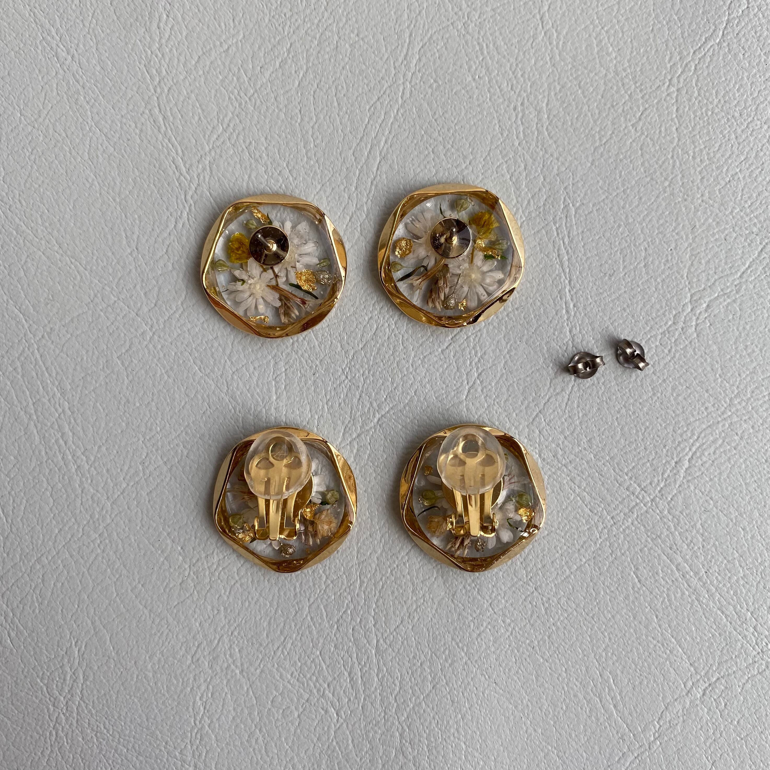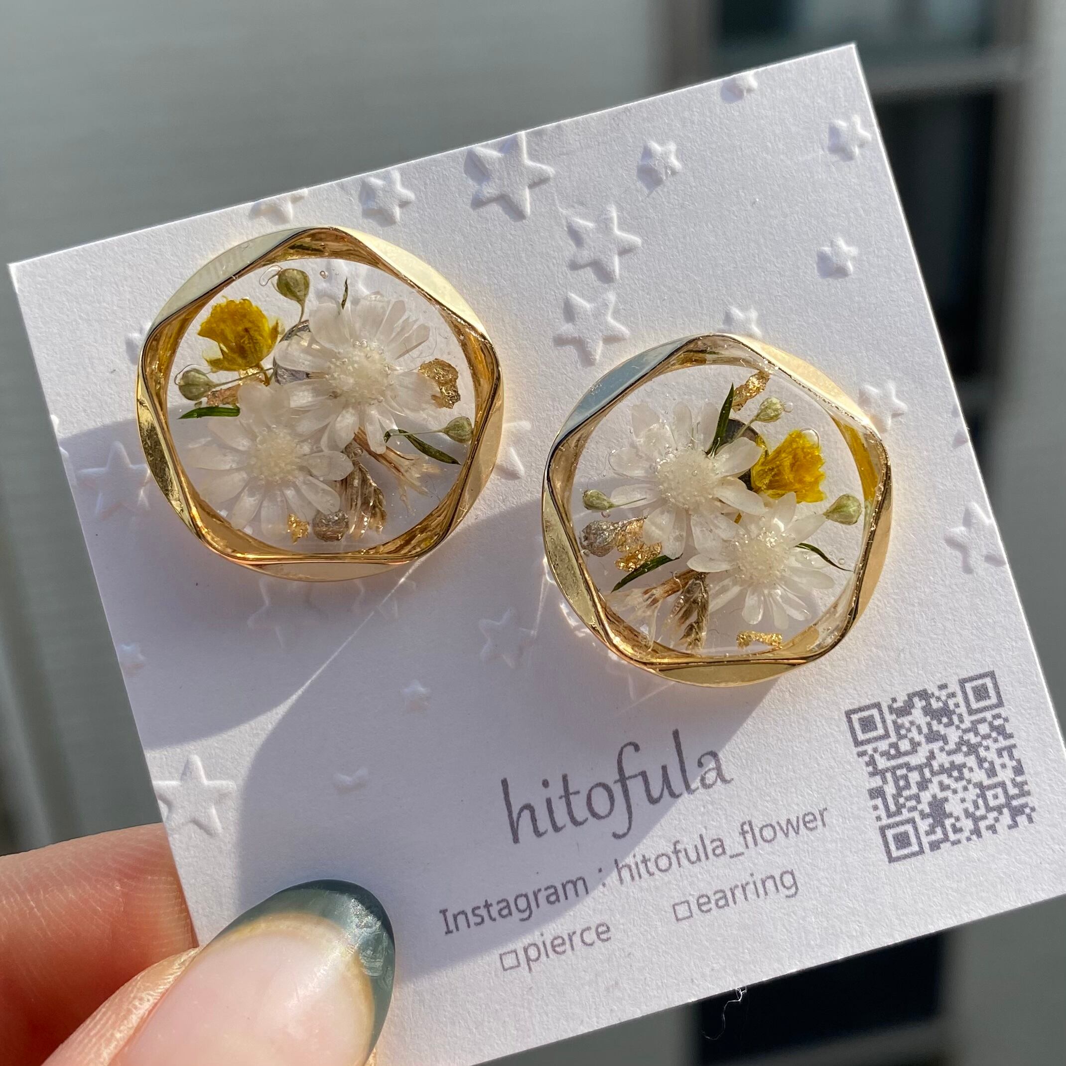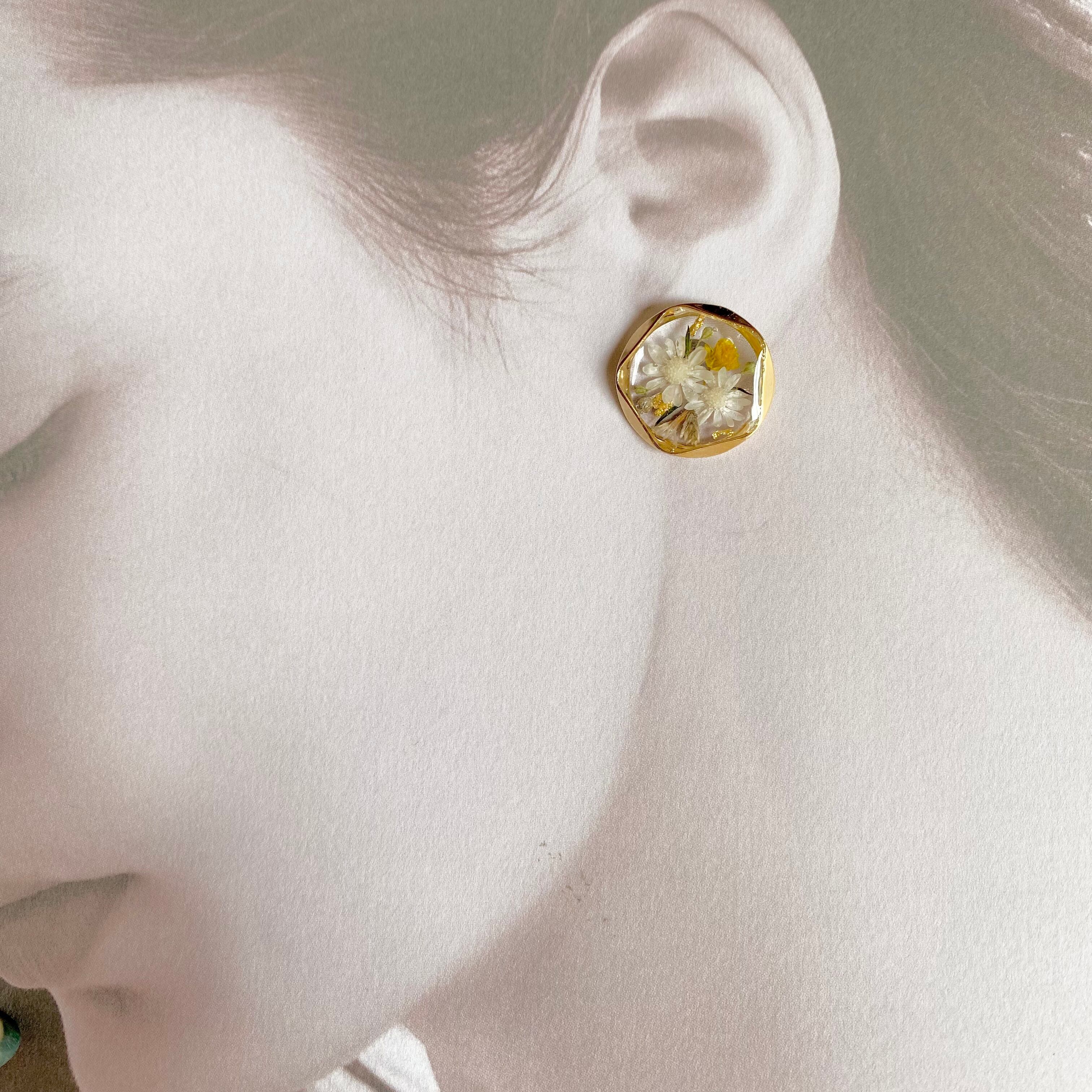 <garden white>ピアス イヤリング 本物のお花 金属アレルギー対応チタンポスト クリップイヤリング